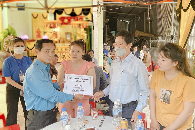 Chiều ngày 07/6/2022, Thường trực Liên đoàn Lao động tỉnh và Thường trực Công đoàn Khu kinh tế Dung Quất và các Khu công nghiệp Quảng Ngãi đã đến nhà đoàn viên Huỳnh Minh Đức tại thôn Phú Lộc, xã Bình Trung, huyện Bình Sơn, tỉnh Quảng Ngãi để thăm hỏi và chia buồn cùng gia đình.