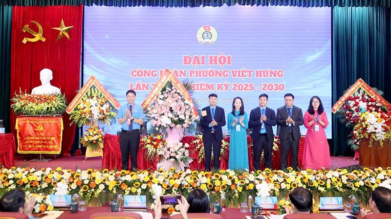 Thay mặt lãnh đạo Tổng Liên đoàn Lao động Việt Nam, đồng chí Tống Văn Băng - Ủy viên Đoàn Chủ tịch, Trưởng Ban Quan hệ lao động Tổng Liên đoàn Lao động Việt Nam tặng hoa chúc mừng Đại hội Công đoàn phường Việt Hưng - Đại hội điểm cấp xã của Liên đoàn Lao động thành phố Hà Nội.