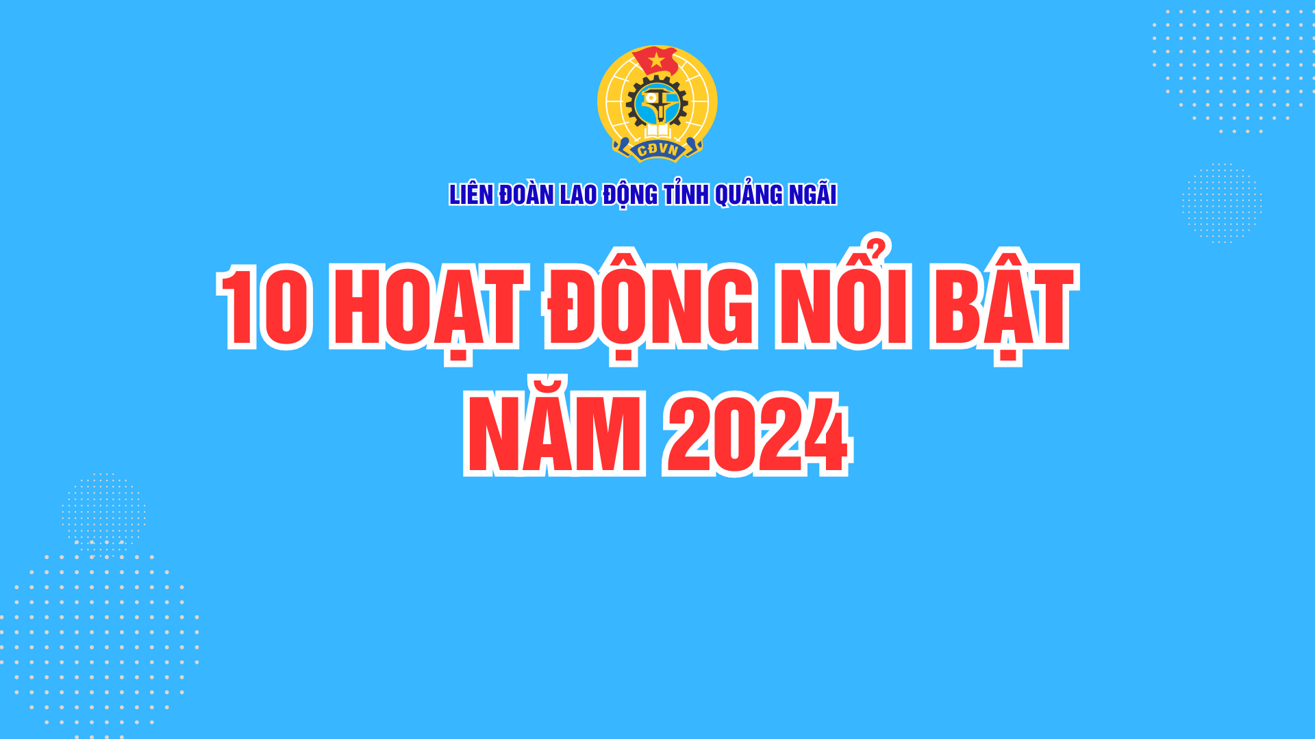 Năm 2024, các cấp công đoàn và đoàn viên, CNVCLĐ trong tỉnh đã đoàn kết, sáng tạo, nỗ lực, thi đua thực hiện Nghị quyết Đại hội XIV Công đoàn tỉnh Quảng Ngãi, Nghị quyết Đại hội XIII Công đoàn Việt Nam; hoàn thành vượt mức các chỉ tiêu, nhiệm vụ và đạt nhiều kết quả nổi bật, lập thành tích chào mừng kỷ niệm những ngày lễ lớn của đất nước và 95 năm Ngày thành lập Công đoàn Việt Nam. Liên đoàn Lao động tỉnh được Ban Thường vụ Tỉnh ủy xếp loại hoàn thành xuất sắc nhiệm vụ năm 2024. Sau đây là 10 hoạt động nổi bật của Công đoàn Quảng Ngãi năm 2024.